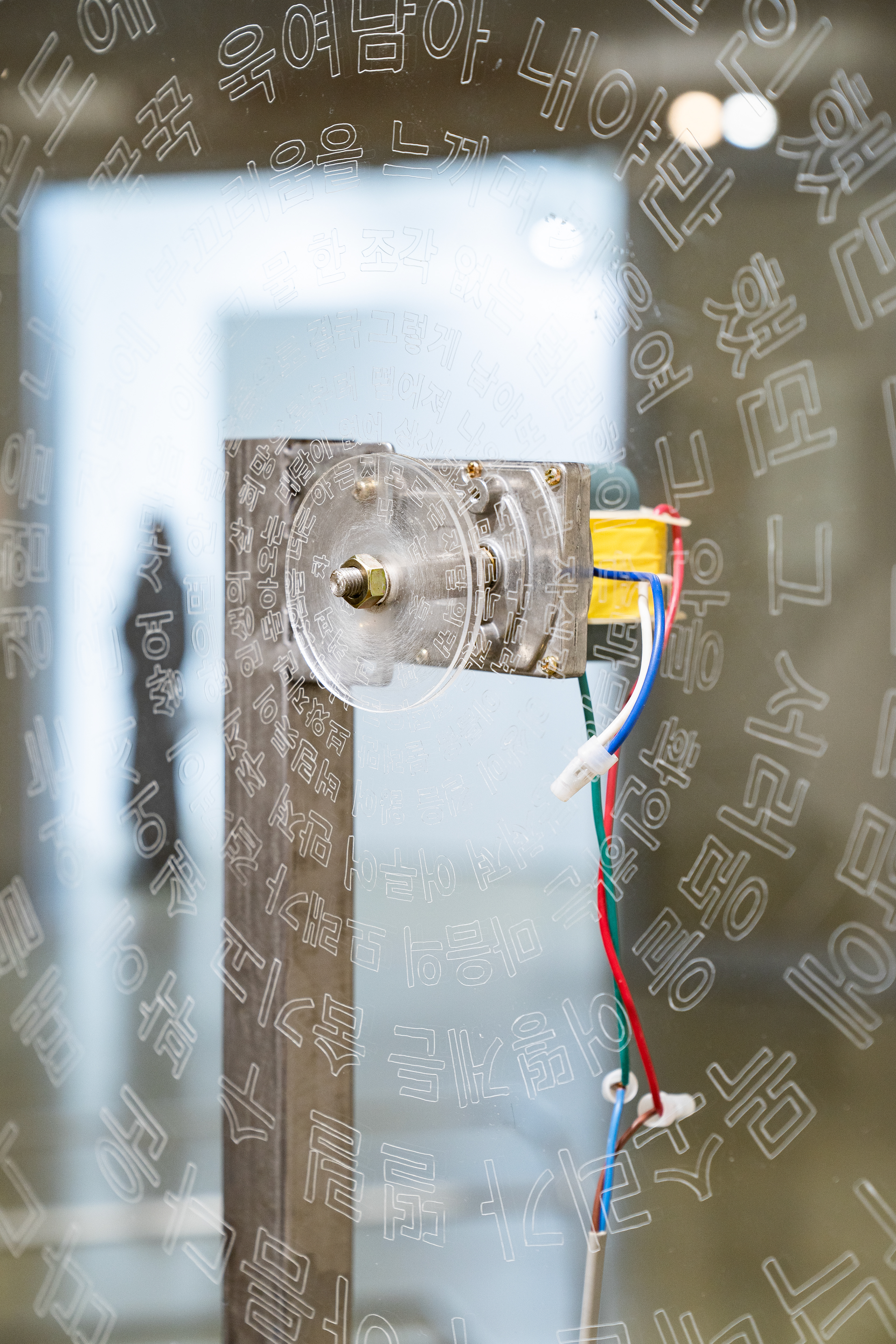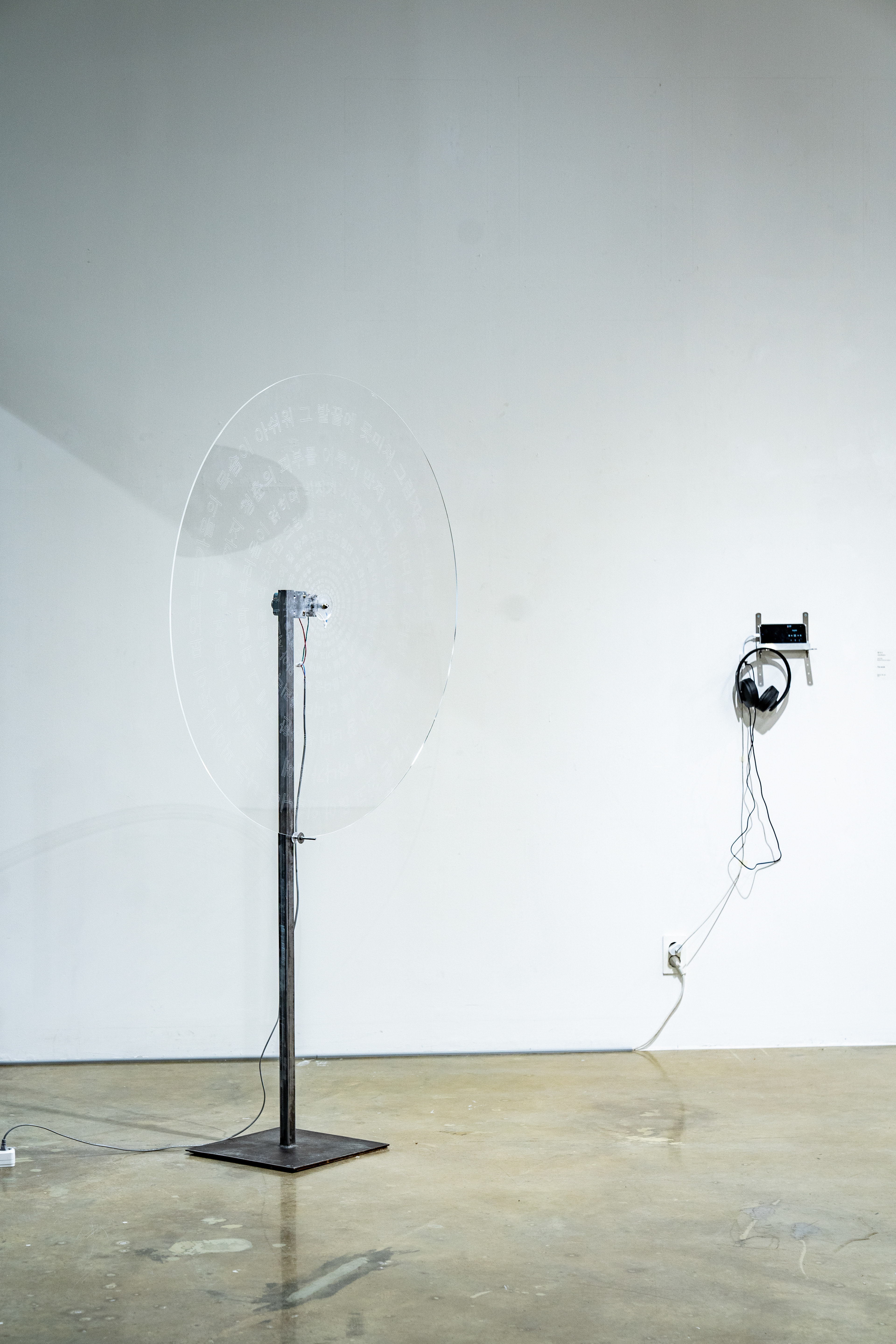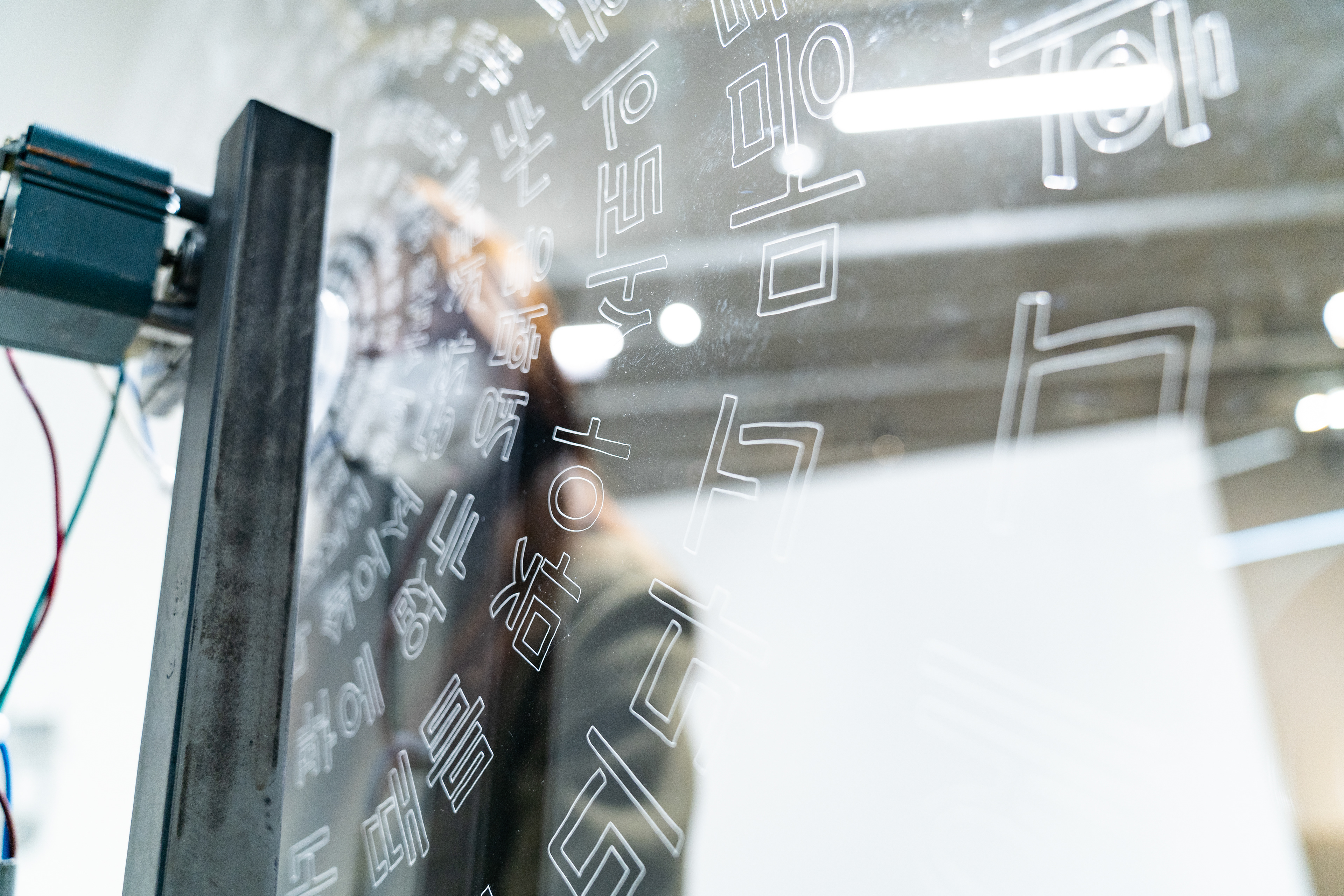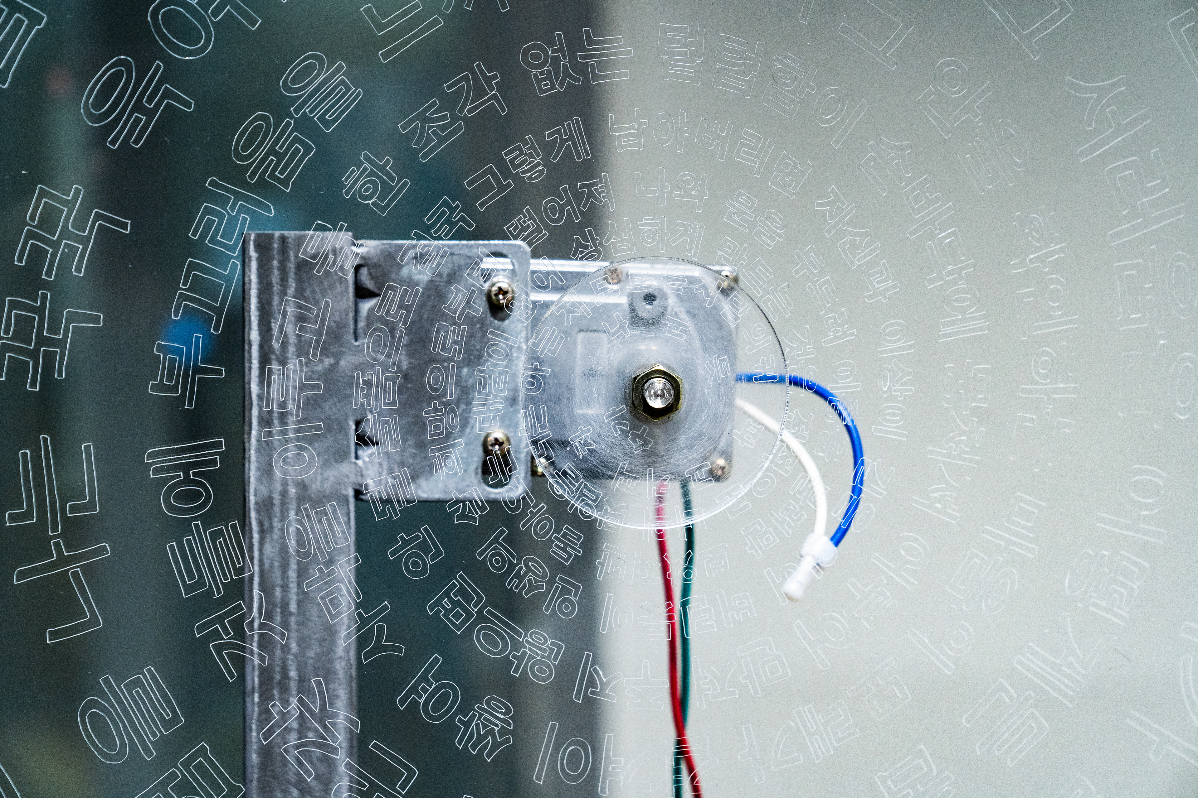 Carved on the acrylic plate is written with the words that do not make any sense, while the plate rotates counterclockwise slowly.